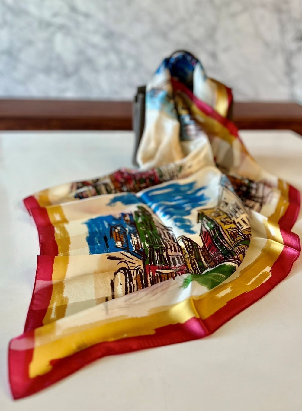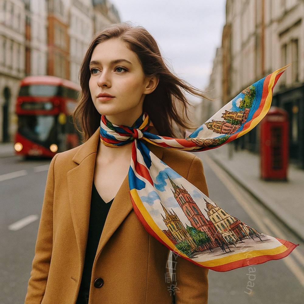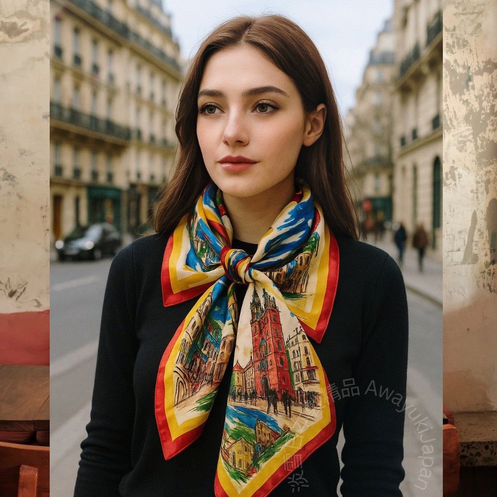 產品描述: 這是一款日式方形真絲圍巾,大道圖案採用絲緞