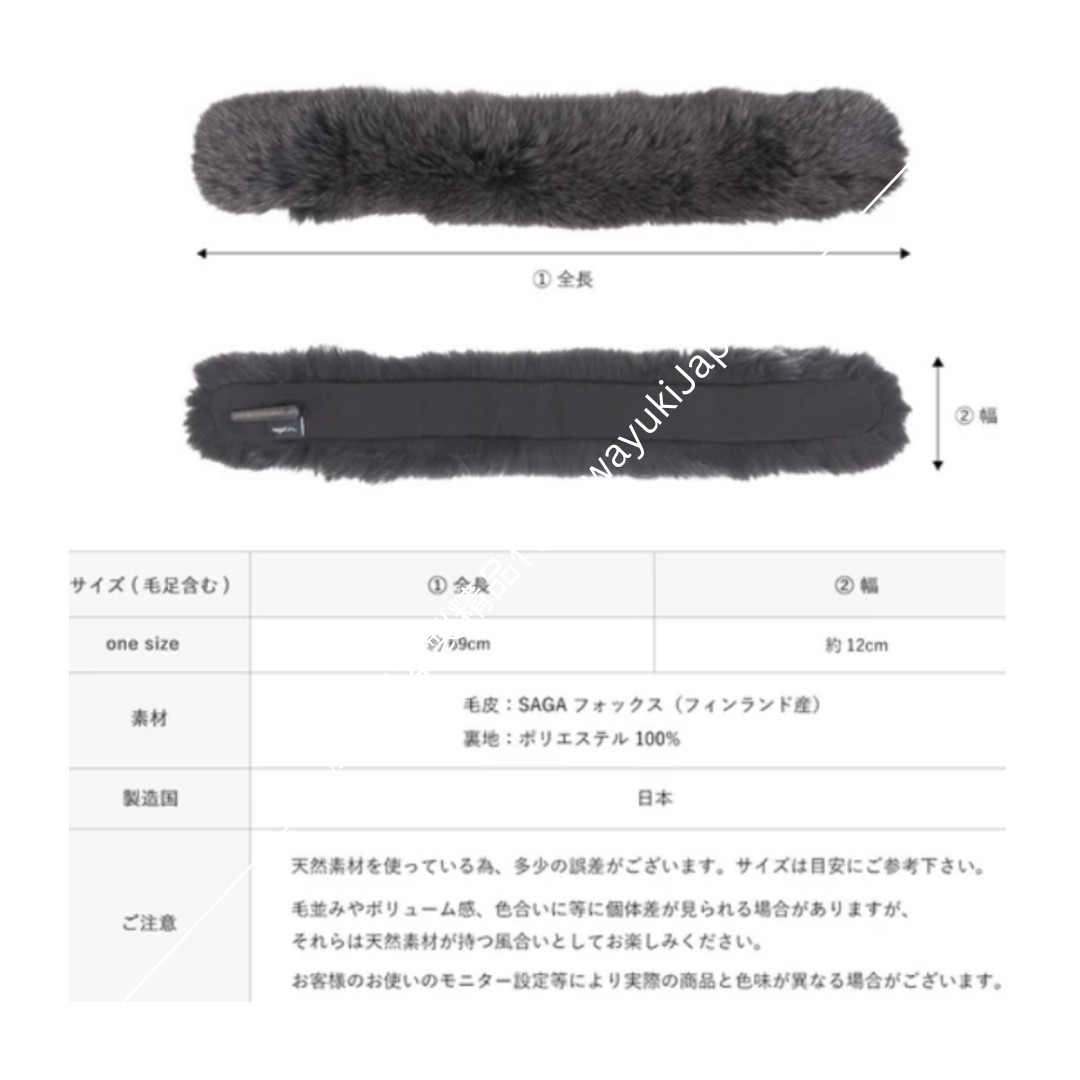 其他類型的毛皮也同樣以高品質著稱。 尺寸: 長度:約 69 cm 寬度:約 12 cm (根據產品不同存在個體差異) 產地:日本 材質:毛皮部分:SAGA狐狸(芬蘭產),襯裡:100%聚酯纖維