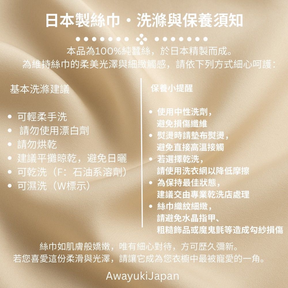 本款絲巾使用被譽為世界最高水準的傳統染色技術「手工捺染」所製成的日本製純蠶絲絲巾。