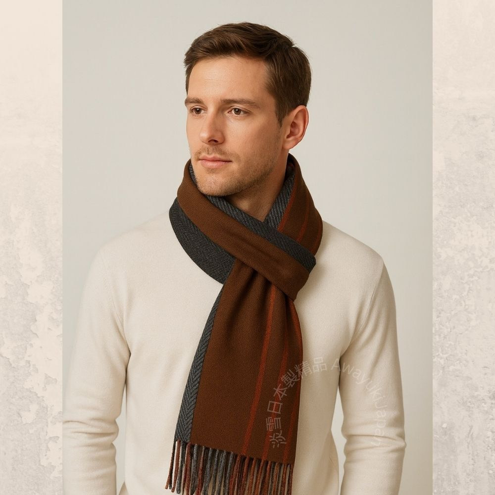 日本製 羊毛圍巾_Équilibre Café(咖啡平衡)-咖啡灰(32x156cm) 圍巾 男生圍巾 日本圍巾 條紋圍巾 雙面圍巾