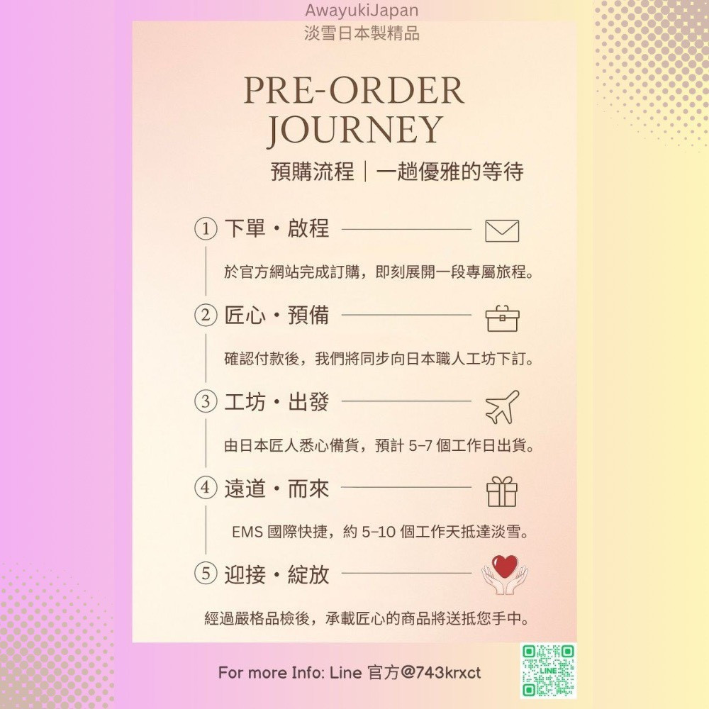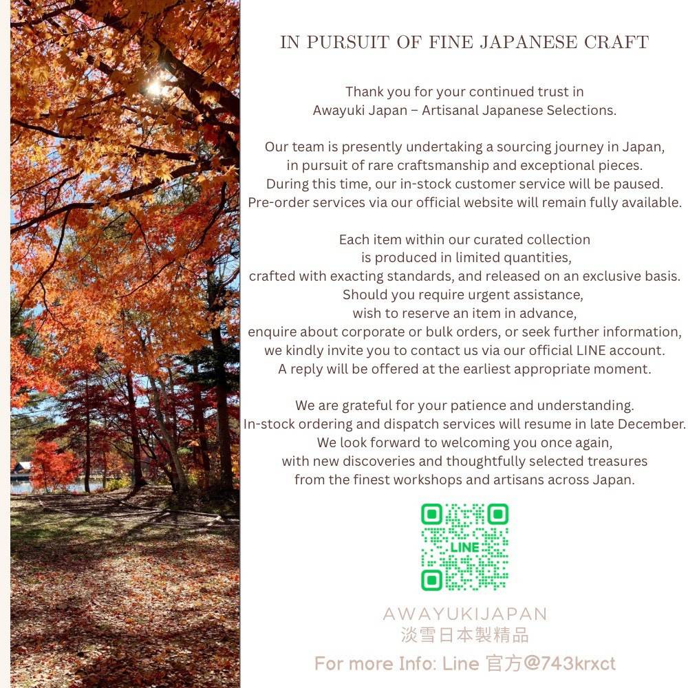 日本匠心採訪旅程 服務告知 感謝您一直以來對 Awayuki淡雪 日本製精品 的青睞與信任。 淡雪團隊現正踏上日本拜訪旅程,以尋訪稀有工藝與卓越作品為目標。 期間將暫停即時現貨客服服務,官網預購服務則維持正常運作。 淡雪精心策選的日本製逸品,皆為日本職人匠心製作、數量有限,並以限量形式獨家推出。 如您有緊急商品需求、希望提前購買商品、或洽詢企業大口注文以及其他資訊,敬請透過官方 LINE 聯繫我們,我們將盡快回覆您。 衷心感謝您的耐心與理解。 現貨訂購與配送服務將於十二月下旬恢復。 期待與您再次相見, 並帶回全新發現與悉心挑選的日本匠心之作,與您一同品味。