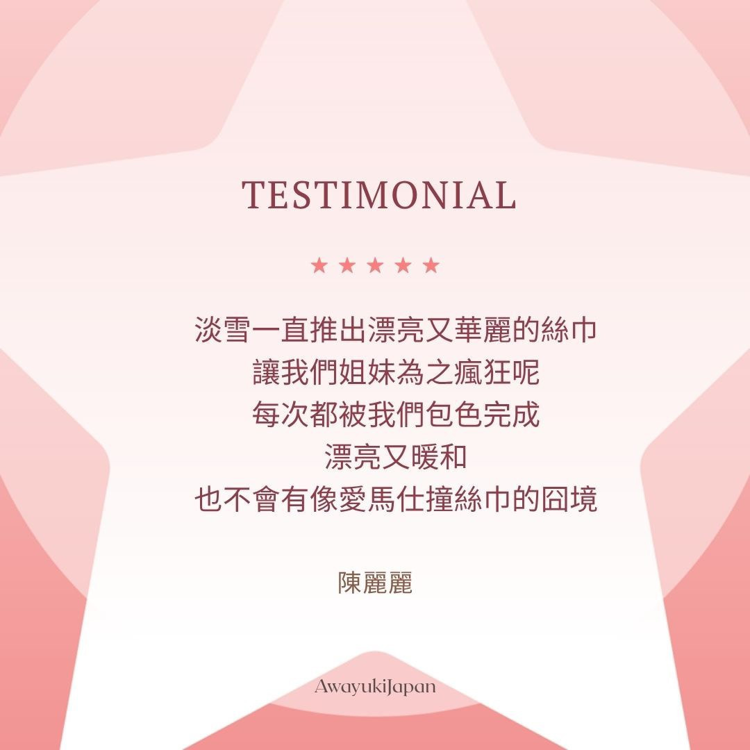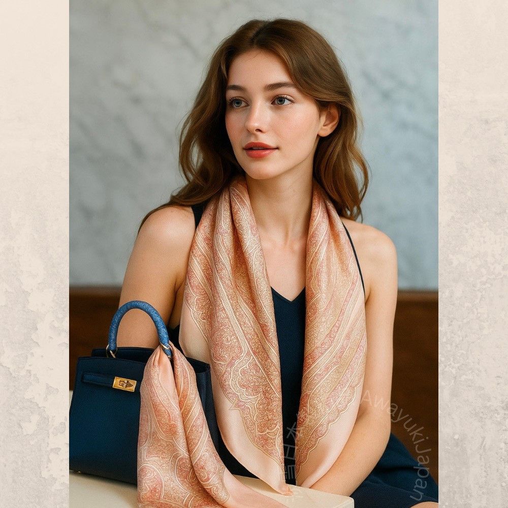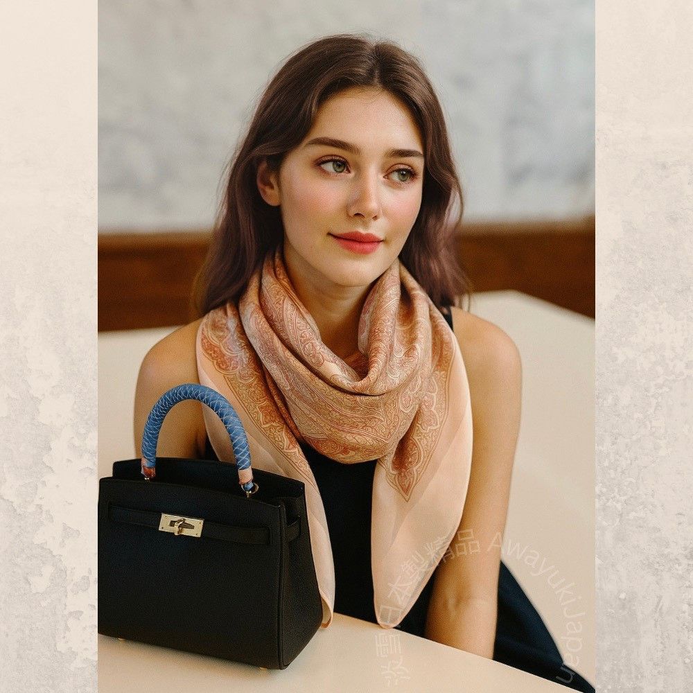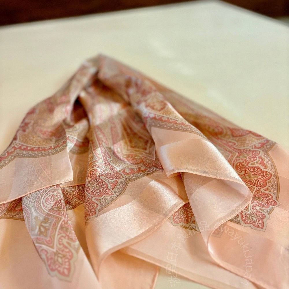 屬於妳自己的光。 尺寸:88 × 88cm 本商品尺寸以製作用樣品平放丈量之實測值為準。 由於職人手工製作的特性,實際成品可能會有約 2〜3 cm 的細微誤差,敬請理解與包容。 ⸻ 規格: ■ 產地:日本製 ■ 材質:100% 絲(Silk) ■ 織法:絲緞條紋織(Silk Satin Stripe)/ 絲綢縮絨雪紡(Silk Baryu Chiffon) ■ 染製方式:手工捺染(Hand Print) 以日本職人手工捺染工藝完成,每一道色層皆經反覆對位與乾燥。 絲緞條紋布面在光線下微微流動,散發出細膩而高貴的光澤。 是一條集柔軟、光感與職人工藝於一身的經典絲巾。 (顏色會因爲光線、電腦、手機色差及拍攝手法而有不同,顏色以實際商品為主/ 本產品不包含拍攝道具)