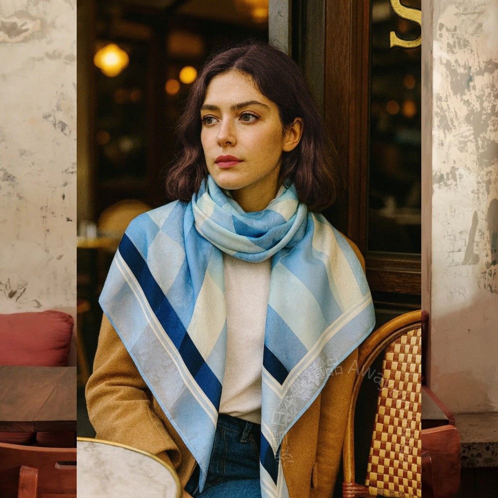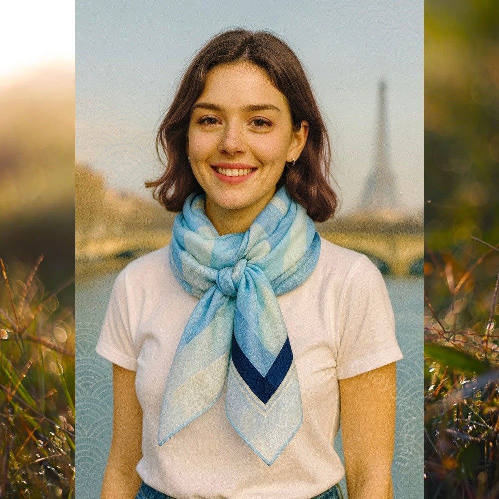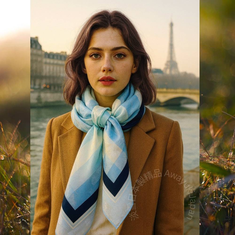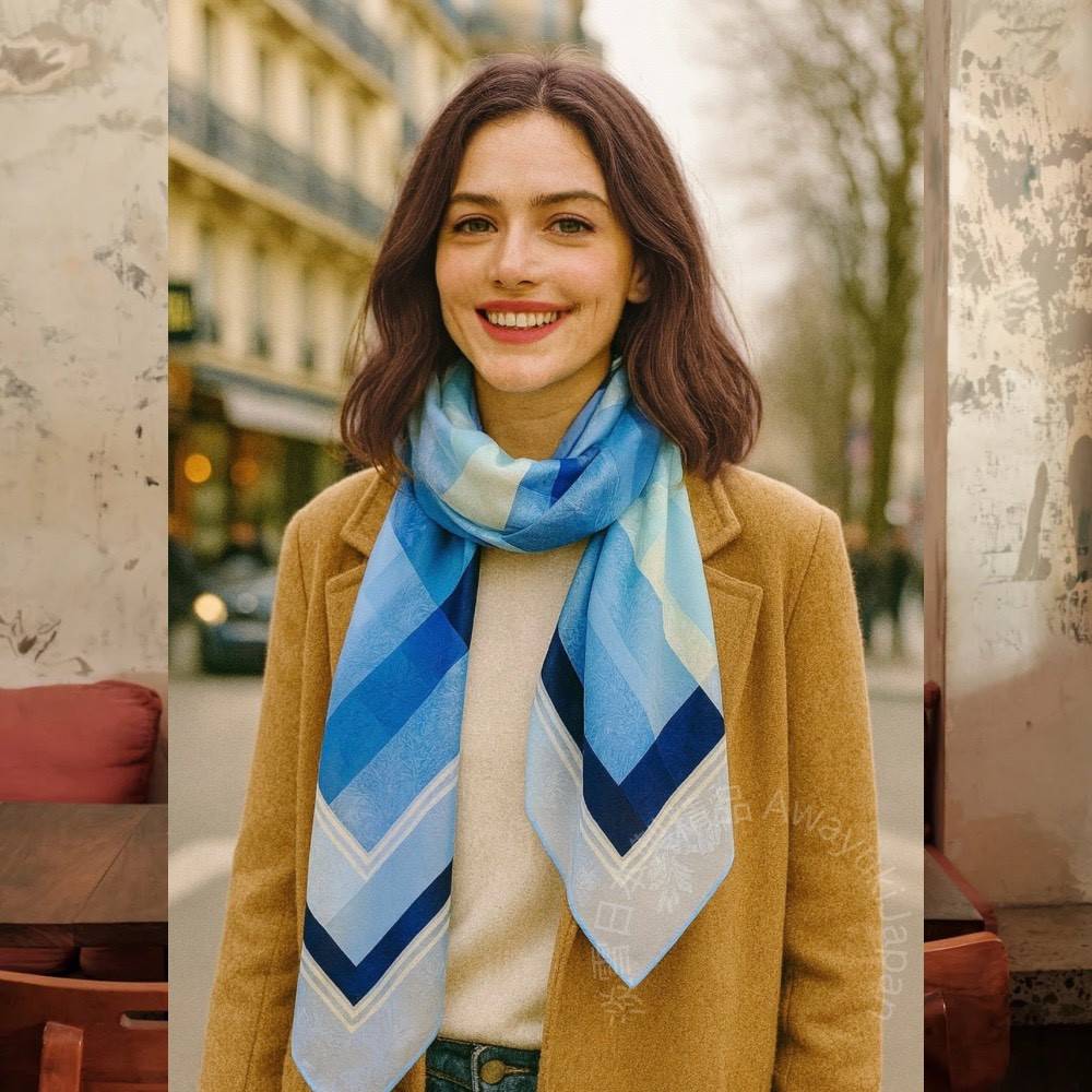 日本製 絲巾_ 光影菱紋Collection Lumières Géométriques-海霧晨藍 Brume Marine (88 × 88cm) 絲巾 方形絲巾 大方巾 日本絲巾 9090 披肩 Awayuki《光影菱紋》系列 清透優雅,不必被看透。 像晨光一樣——柔軟、堅定、自帶光芒。 ⸻ **1️⃣《海霧晨藍 Brume Marine》 — 巴黎:塞納河的靜藍晨光** 清晨六點的巴黎,塞納河被薄霧輕輕遮住, 只有柔藍的光穿過橋影,落在妳的肩上。 這條藍,清透卻不冰冷; 安靜卻有力量。 它像妳—— 看似平和柔軟,卻深藏著 自己的方向與深度。 優雅,不是被看見;是被理解以前, 妳已先理解自己。 ⸻