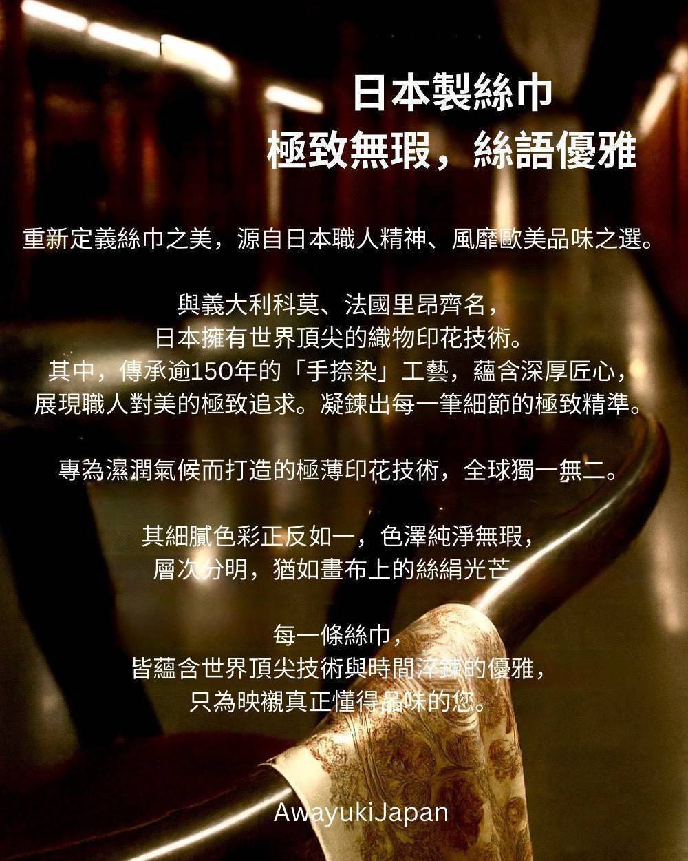 此系列絲巾以兩種極致纖細的日本織工藝交織而成: 絲緞條紋織(Silk Satin Stripe), 以光澤柔滑的經緯交錯出低調的條紋浮影, 在光線下呈現如同光影與晨曦的層次光暈; 絲綢縮絨雪紡(Silk Baryu Chiffon), 質地輕盈透氣,賦予整條絲巾柔軟的 流動感與輕盈的垂墜線條。 每一條皆由日本職人以傳統 手工捻染(手捻り染め)技法製作。 染料在絲線間緩緩滲透、交錯,呈現細膩的暈染層次。 這種手染方式需要極高的專注與經驗, 僅有熟練的匠人能掌握染料與絲線的「呼吸」, 讓每一條絲巾皆擁有獨一無二的光澤流動。 ✨Awayuki《光影菱紋》系列 每一種顏色,都有屬於自己的光。 ⸻ 1️⃣ 海霧晨藍 Brume Marine(深藍×霧藍) 光澤描述: 海霧晨藍呈現 霧藍與深藍交錯的雙層光影感。 布面在自然光下會產生淡淡的冷調反射, 深藍區塊則像夜裡的海面,有微微的深邃亮度。 整體光澤冷靜、清透,卻帶著不可輕易看透的深度。 適合: 不愛太亮、希望顯得氣質沉穩、但依然想有柔光的你。 ⸻ 2️⃣ 玫霧花曦 Rosée Florale(粉霧粉×玫瑰灰) 光澤描述: 柔粉與白壓紋交錯處呈現 柔焦般的輕盈亮度, 粉色不是甜,而是「帶霧感的清透亮」。 玫瑰灰部分在光線下會呈現內斂的反射, 讓整條絲巾看起來溫柔但有界線,不會被粉色看穿。 適合: 喜歡柔軟色系,但不希望顯得稚嫩或過度甜的人。 ⸻ 3️⃣ 琥光暖曦 Aube Ambrée(杏橙×柔金) 光澤描述: 琥珀橙與淡金的光澤非常細緻, 在日光下呈現 像暖陽一般的金霧光, 亮卻不刺眼,暖卻不厚重。 絲巾布面有微微「絲光般的明亮感」, 讓整體多了一點迷人的金色層次。 適合: 需要氣色更好、暖光提升膚色、想呈現柔暖魅力的人。 ⸻ 4️⃣ 雪映晨光 Clarté Neige(冰藍×奶白×淡鵝黃) 光澤描述: 這款的光澤具「清透感」: 冰藍區塊呈現 乾淨的冷光, 奶白與淡鵝黃在光線下會呈現「羽毛般的柔亮」。 整條絲巾的亮度最輕、最淡, 彷彿北歐晨光落在雪地上的那種透明亮。 適合: 喜歡乾淨、淡系、極簡感,但又不願被看穿的你。 ⸻ 🌅 Awayuki《光影菱紋》系列穿搭指南 四種晨光,四種妳的樣子。 ⸻ 1️⃣ 海霧晨藍|Brume Marine 沉靜藍 × 霧藍 × 奶油色 💙「知性、極簡、冷調光感」的最佳代表。 穿搭建議: ✔ 白襯衫 × 海霧藍絲巾(經典繞脖) 讓藍色光澤凸顯臉部線條,整體知性感提升。 ✔ 深藍西裝外套 × 三角披肩法 藍上加藍,呈現「同色系高級感」。 ✔ 灰色針織上衣 × 法式側結 柔霧藍在毛料上呈現微光,冷淡風必備。 ✔ 牛仔褲 × 象牙白T × 法式小結 清新、乾淨、輕鬆,比項鍊更有存在感。 最適合: 喜歡冷色調、高級感、日常也能變精緻的妳。 ⸻ 2️⃣ 玫霧花曦|Rosée Florale 粉霧粉 × 玫瑰灰 × 奶白 🌸柔軟但不甜、浪漫帶界線。 穿搭建議: ✔ 奶油白上衣 × 玫霧粉(柔繞脖兩圈) 柔粉光澤靠近臉部能「提亮氣色」。 ✔ 粉灰大衣 × 隨性披肩法(肩上輕搭) 整體色系融合,不過度粉嫩,成熟又柔美。 ✔ 淺牛仔 × 淡粉針織 × 小蝴蝶結法 適合早春或櫻花季,日常也很仙。 ✔ 米白洋裝 × 三角前結 讓粉色成為整體亮點,優雅且氣質。 最適合: 喜歡浪漫但不做作、想顯白顯嫩卻有份量感的妳。 ⸻ 3️⃣ 琥光暖曦|Aube Ambrée 杏橙 × 柔金 × 淡琥珀 🧡自帶暖光、氣色神級提升。 穿搭建議: ✔ 奶茶色大衣 × 琥光暖曦(大披肩) 溫暖層次立刻出現,秋冬最美搭法。 ✔ 白襯衫 × 杏金絲巾(前結法) 整體看起來精神好、有活力但依然優雅。 ✔ 暖棕針織 × 法式繫帶 杏橙反射暖光,讓膚色更明亮。 ✔ 一字領上衣 × 戴成髮帶 金 暖色在髮際線附近很顯氣質,拍照超美。 最適合: 想提亮氣色、喜歡溫暖色光、穿淺色系特別好看的人。 ⸻ 4️⃣ 雪映晨光|Clarté Neige 冰藍 × 雪白 × 淡鵝黃 ❄️清透、純淨、北歐光感。 穿搭建議: ✔ 米白針織 × 輕繞一圈(自然垂落) 讓絲巾像晨光一樣柔,乾淨又高級。 ✔ 淺藍襯衫 × 雪映晨光(打成法式側結) 藍上加藍,非常清爽,適合春夏或日本旅拍。 ✔ 奶油色大衣 × 三角披肩 優雅又不厚重,呈現透明亮光澤。 ✔ 短T × 牛仔裙 × 小絲巾綁包包 休閒但很精緻,絲巾光澤會讓包包升級。 最適合: 喜歡乾淨系、無印系、北歐感、 穿清淡色系顯得特別氣質的妳。 ⸻ 尺寸:88 × 88cm 本商品尺寸以製作用樣品平放丈量之實測值為準。 由於職人手工製作的特性,實際成品可能會有約 1〜2 cm 的細微誤差,敬請理解與包容。 ⸻ 規格: ■ 產地:日本製 ■ 材質:100% 絲(Silk) ■ 織法:絲緞條紋織(Silk Satin Stripe)/ 絲綢縮絨雪紡(Silk Baryu Chiffon) ■ 染製方式:手工捺染(Hand Print) 以日本職人手工捺染工藝完成,每一道色層皆經反覆對位與乾燥。 絲緞條紋布面在光線下微微流動,散發出細膩而高貴的光澤。 是一條集柔軟、光感與職人工藝於一身的經典絲巾。 (顏色會因爲光線、電腦、手機色差及拍攝手法而有不同,顏色以實際商品為主/ 本產品不包含拍攝道具) 《關於日本職人手作》 日本職人手作,從來不可能「完美」。 即使製程嚴謹,每一針每一線 都傾注專注與細心,但因出自於人, 作品中總有人的溫度與痕跡。 一件真正完美的作品,並非外表無瑕, 而是以安全安心的材料、謹慎的製程、 以及最終與肌膚貼合觸感、 與您的氣質相映的為本。 敬請理解,這份不完美,正是手工藝的真實與美好。 (在淡雪,每一條絲巾都由日本職人親手縫邊。 手作的細微痕跡,非瑕疵,